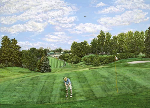 The siblings decided on dad and the dog on the porch, mom gardening, and they wanted golf clubs that said Penn State on the bag. This was because the sons had scholarships for golf at Penn State, and one went on to be the head coach for golf at Penn State. A very personal family painting.