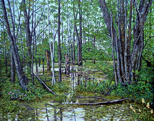 I have always loved bogs and find beautiful detail to paint. "Wetlands " is a 24" by 30" oil on canvas painting, of a scene that I found on the 15th sideroad north of Palgrave ,Ontario.